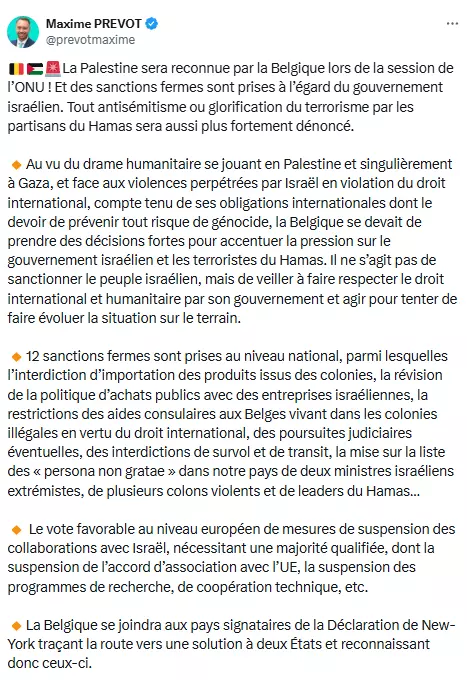 Belçika Dışişleri, Avrupa İşleri ve Kalkınma Bakanı Maxime Prevot, X hesabından yaptığı açıklamada, BM Genel Kurulu’nda Filistin’i tanıyacaklarını açıkladı. Prevot, İsrail’e de yaptırımlar uygulanacağını duyurdu.