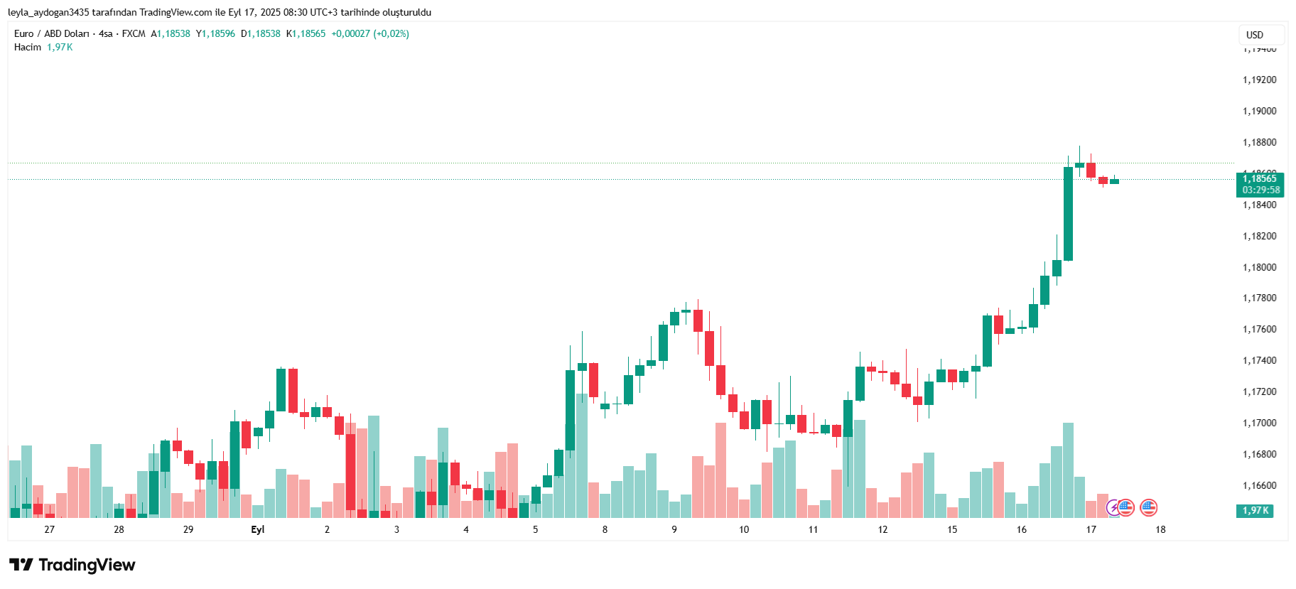 Fed’in faiz indirimine gideceğine yönelik beklentiler hızla yükselirken dolar giderek değer kaybediyor. Euro/dolar paritesi tüm zamanların en yüksek seviyesini olan 1,1879’u gördü. Şu sıralar 1,1857’de hareketleniyor.