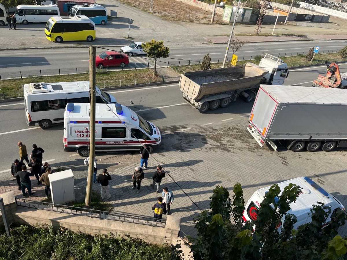 Iğdır’da, Çevre ve Şehircilik Müdürlüğü önünde meydana gelen kazada, polisleri taşıyan bir minibüs, yolcu indiren tır ve arkasındaki kum kamyonuna çarptı.