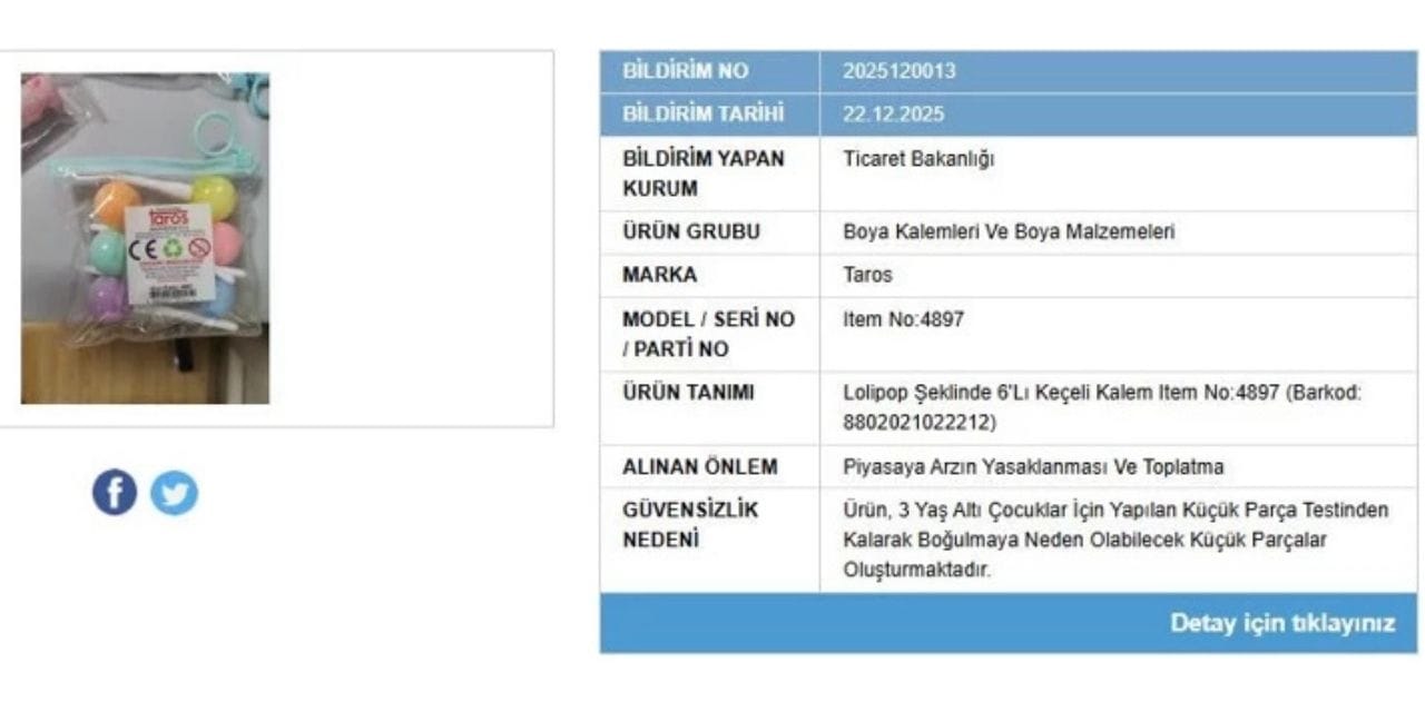 Bakanlık denetçilerinin incelemeleri sonucunda “Taros” markalı boya malzemesi kırtasiye ürününün, belirlenen güvenlik standartlarını karşılamadığı ve kullanımının riskli olduğu tespit edildi.
