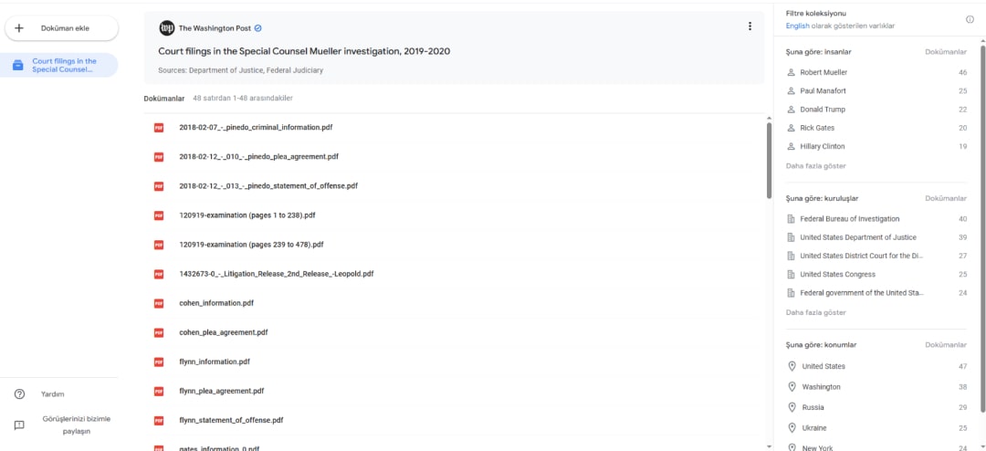 Washington Post gazetesinin bir Pinpoint koleksiyonu kapsamında, birkaç yıl önce ABD’de önemli bir gündem maddesi oluşturan Mueller Soruşturması’na dair belgeler analiz edilmektedir. Onlarca belgede geçen isimleri filtreleyerek incelemek mümkündür.